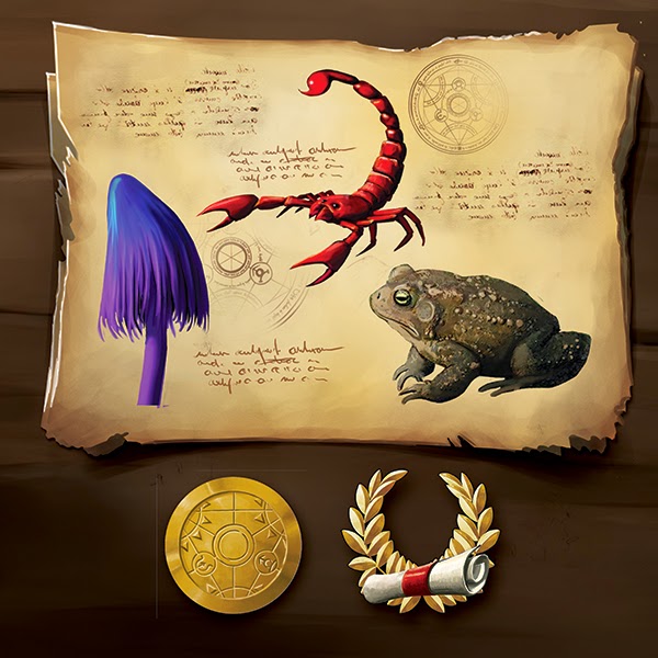 在遊戲不同的時間點,你可以把兩種材料混合在一起,並把卡片放到你擋板後,然後使用 app 掃描這些卡片,它會告訴你混合的結果。用你的推測能力,執行多次試驗後,你將開始了解材料的煉金屬性。
