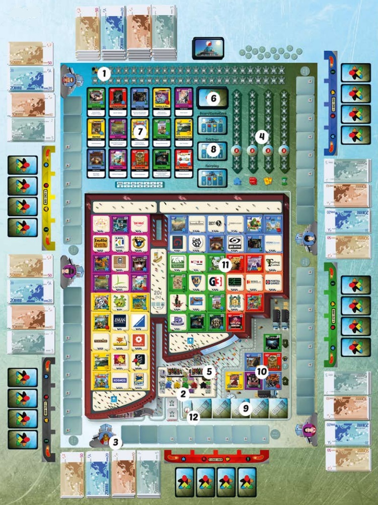 願望清單卡區域右側有願望清單卡的牌庫放置區 (米寶圖案) (圖左排),緊接著下方有排名卡的放置區,分別用三個極具影響力的桌遊論壇網站作代表,分別有 BoardGameGeek、TricTrac,以及 Fairplay Magazine。