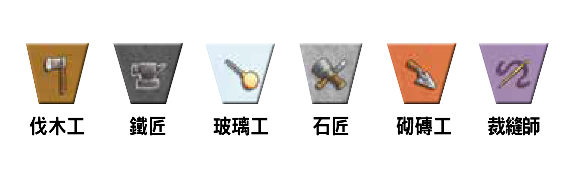 翻到正面,上面總共顯示六個工會,由上到下分別是:玻璃工、伐木工、砌磚工、裁縫師、鐵匠、石匠。