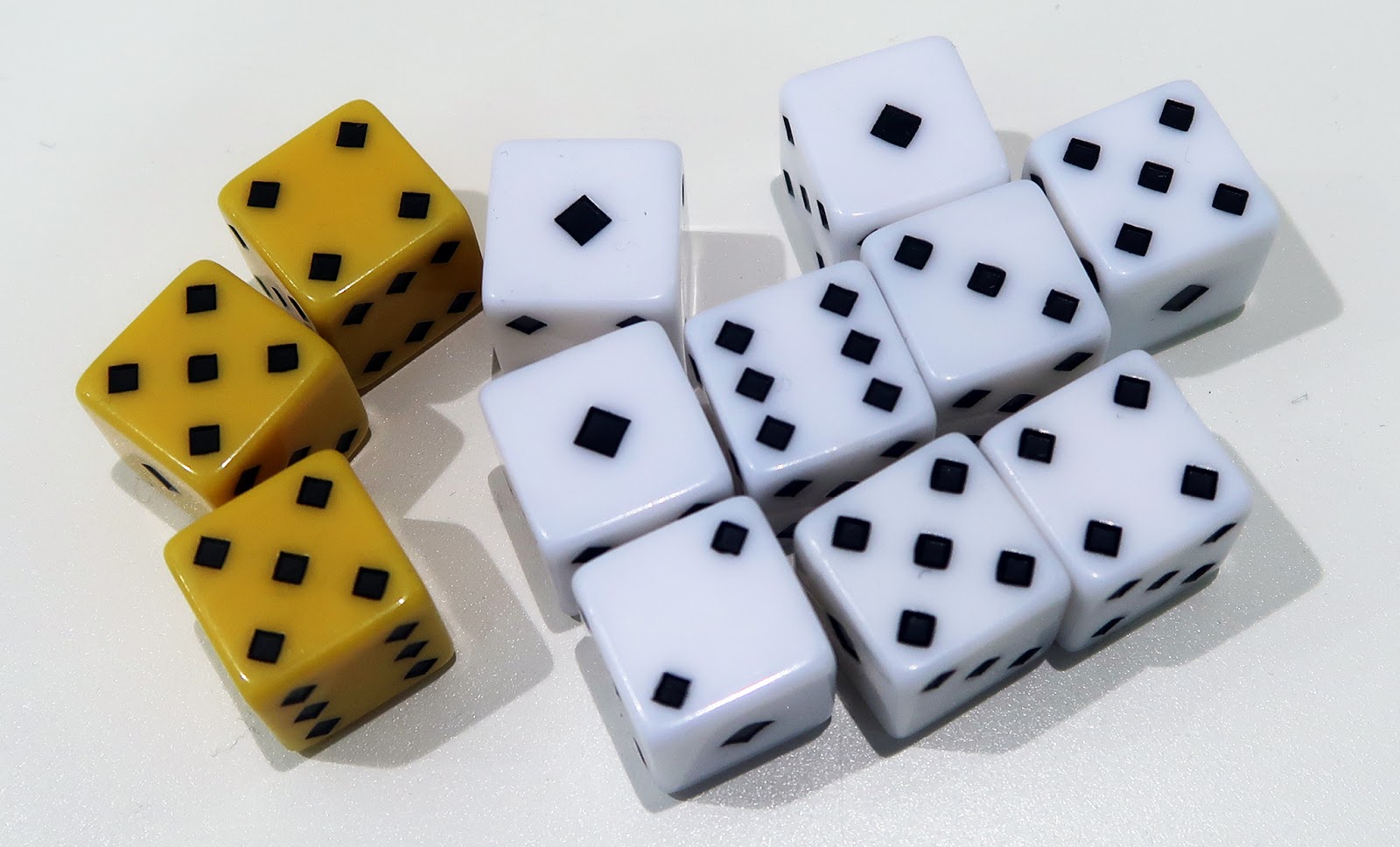 如果他們想要,他們可以購買至多 3 顆黃色骰子。每顆骰子花費 1 元 (為了花費 1 元,只需要把圈起來的符號劃掉即可)。同時他也拿取 9 顆白色骰子並擲骰。