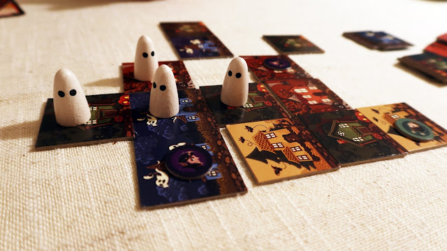遊戲來試玩一下,剛好是萬聖節周末!首先先按照說明書把建築板塊排成特定的樣子,特定建築放上幽靈,然後每位玩家拿取他們的指示物並抽 2 張任務牌,就可以開始遊戲囉。