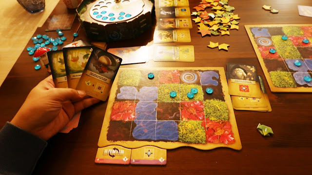 每位玩家基本遊戲會有 2 個行動板塊,每回合可以用一次,但每次用到要花 3 個葉子,一個可以讓你重洗展示區的牌,一個可以移動露珠一格。