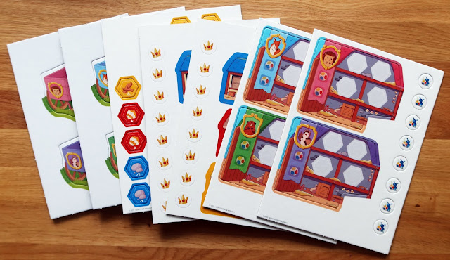 玩家圖板。左邊上面可以放玩家躑的骰子,右邊則有三個商店以及對應顏色所需的兩個裝飾品板塊 (這裡,板塊已經是資源而且不需要拼放了,還做成六角只是為了跟原版有點連結……)。最右邊的缺角是讓玩家放置推車的地方。