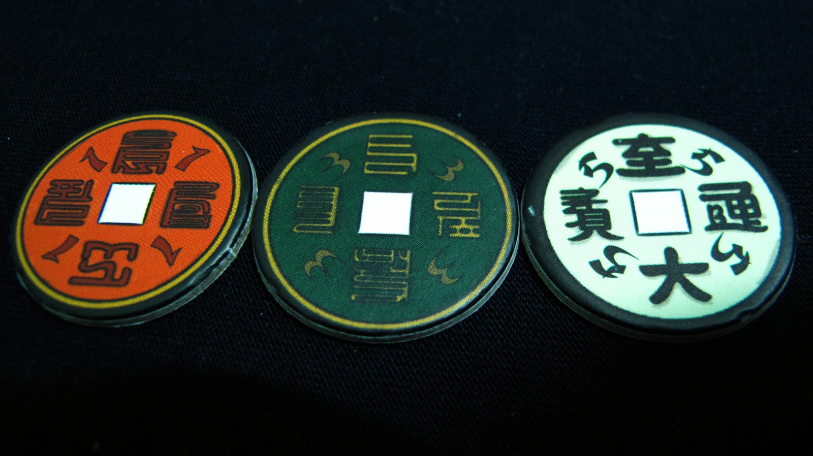 先來看看通寶幣吧。我覺得這通寶幣很可能是自己用鑿洞工具敲出來的,因為邊緣很不齊...好吧看在是小公司...。有機會拿真的銅幣玩或許會更有fu。