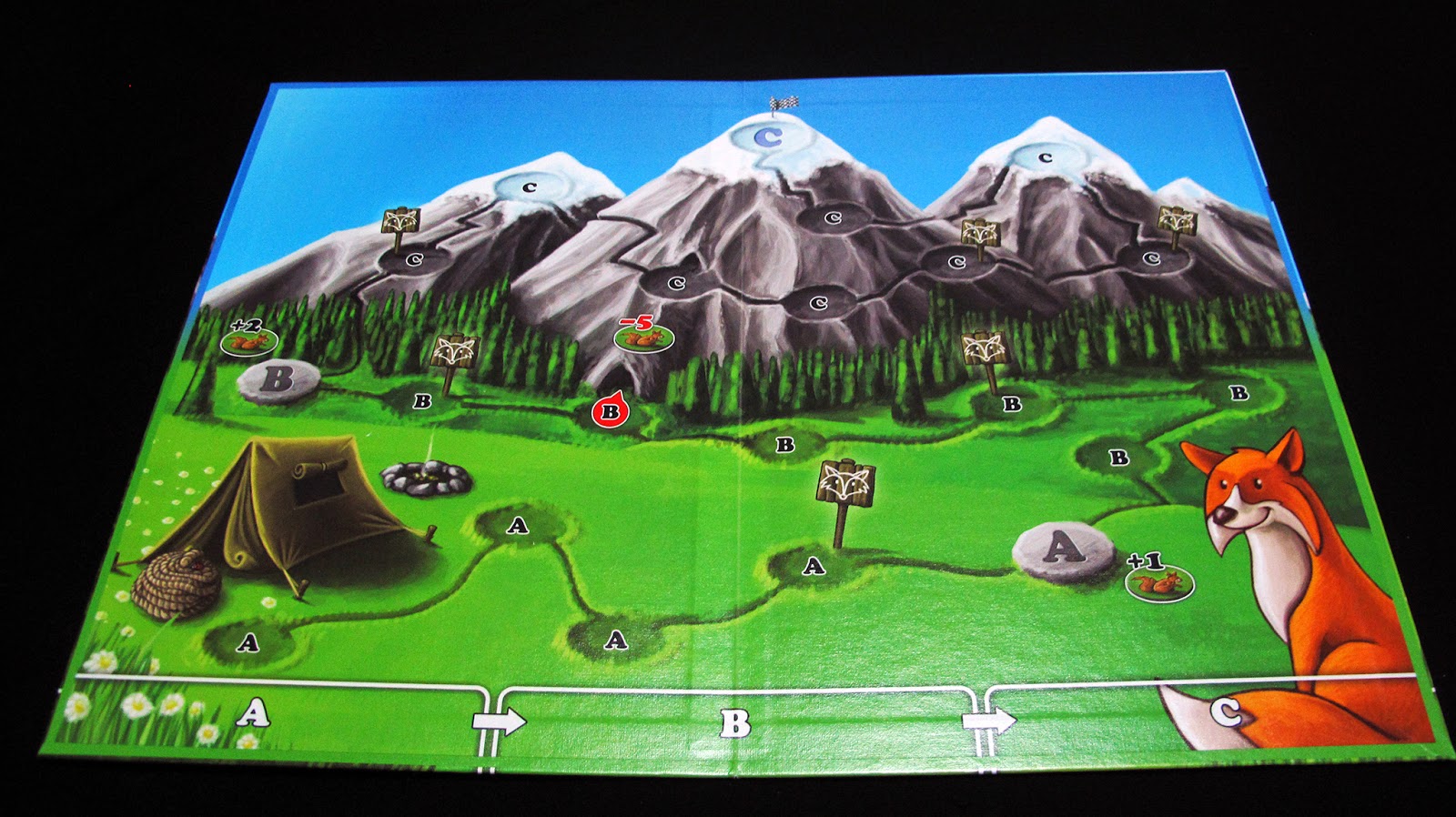圖板的另一面專給團隊合作的變體使用!可以看到少了貓頭鷹板塊放置區,一樣有捷徑,但是多了狐狸!玩家這時要小心狐狸囉,因為松鼠會躲起來不能使用!