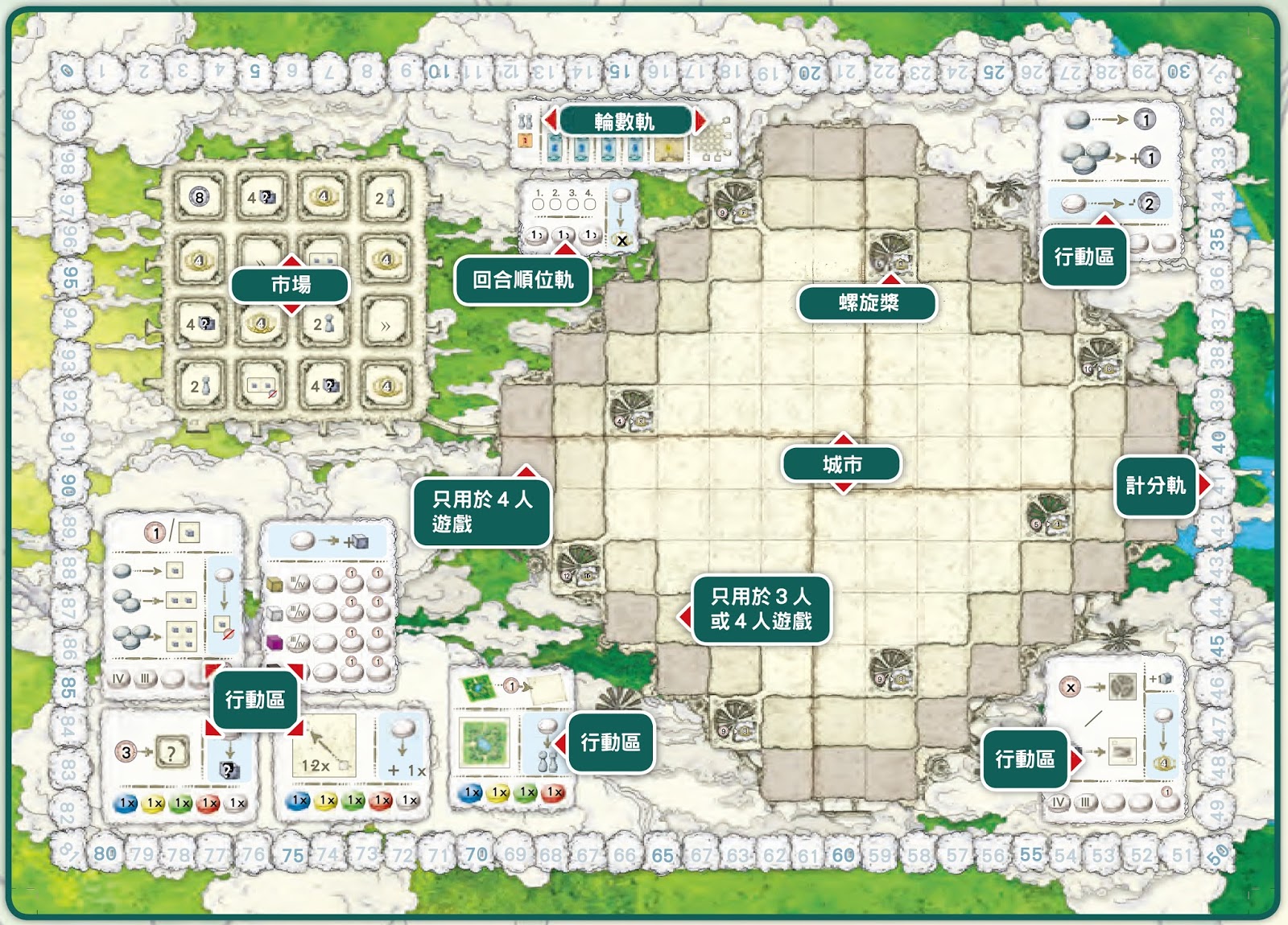註記:城市最外圈灰色的方格只用於 4 人遊戲;下一圈淺灰色的方格用於 3 人或 4 人遊戲。2 人遊戲時,灰色與淺灰色外圈都不使用。