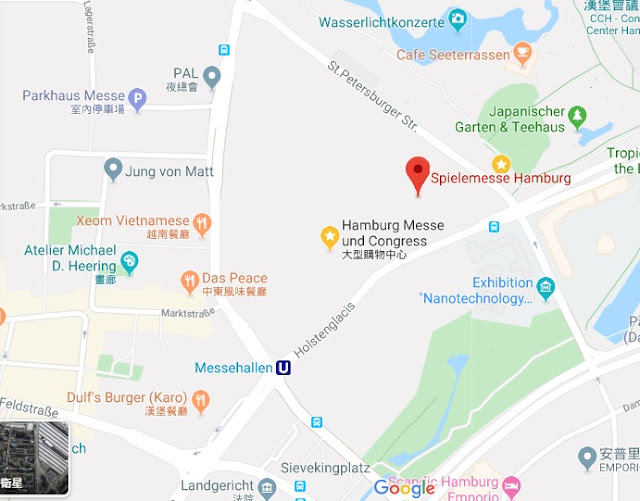 現在交通都很方便,一樣透過地鐵就可以了。黑色圈起處就是漢堡展覽中心站,離中央車站只有兩站遠,非常方便。漢堡展覽中心一樣占地廣幅,而且又在交通黃金地帶,桌遊展辦在這裡的話,未來很有潛力。