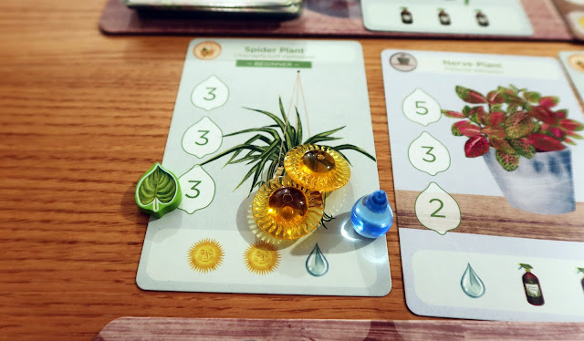 培育時很簡單,看這植物需求什麼,你就付顯示的資源。如上圖左邊這盆植物,它需要兩個太陽和一滴水,如果你有支付的話,你可以把一個成長葉子放到成長區第一格 (須由上而上依序放置),遊戲結束會獲得有放葉子的成長區分數。
